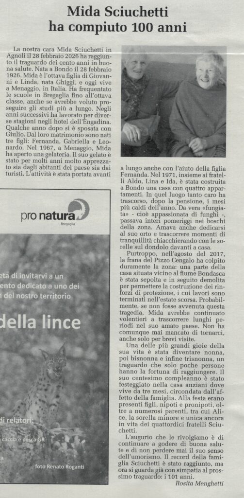 A Menaggio si è festeggiata una vera protagonista: Mida Agnoli-Sciuchetti, decana della famiglia Sciuchetti di Bondo, che ha raggiunto il traguardo dei cento anni! L’evento ha richiamato numerosi parenti da diverse regioni, tutti desiderosi di condividere gioia e affetto in questa occasione straordinaria.
